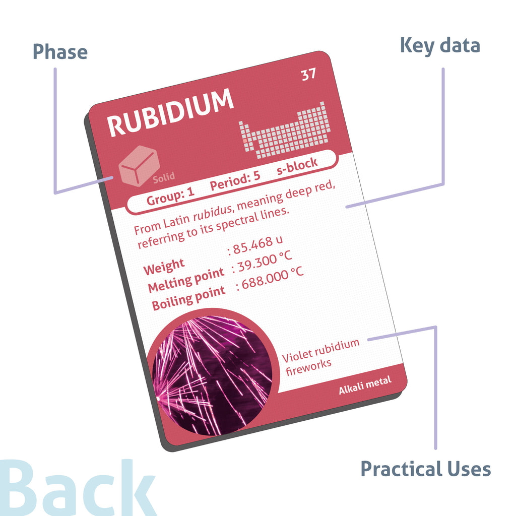 - One side displays chemical symbol, the other side displays the name, its atomic number, weight, melting point, boiling point etc... with diagram of electron configurations. Theme color represents its element category